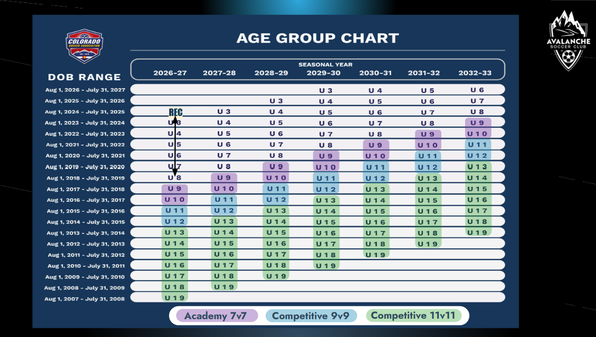 Refer to the chart below for the team age based on the player's age group. For players younger than U9, contact a local recreation center, such Wheat Ridge or Denver, for recreational options.